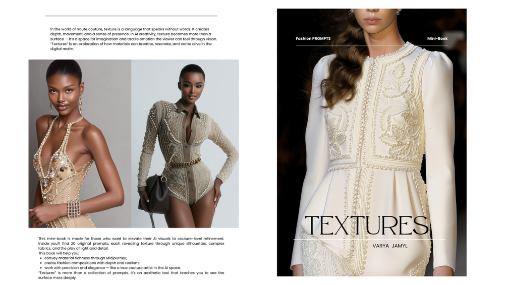 This mini-book is made for those who want to elevate their AI visuals to couture-level refinement. Inside you’ll find 20 original prompts, each revealing texture through unique silhouettes, complex fabrics, and the play of light and detail.